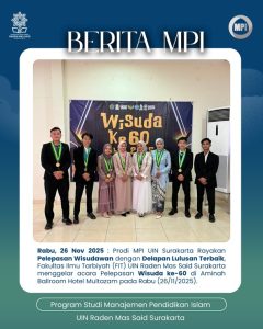 Fakultas Ilmu Tarbiyah (FIT) UIN Raden Mas Said Surakarta menggelar acara Pelepasan Wisuda ke-60 di Aminah Ballroom Hotel Multazam pada Rabu (26/11/2025). Kegiatan ini dihadiri oleh 218 wisudawan dan wisudawati yang sebelumnya telah mengikuti prosesi wisuda resmi pada 12–13 November 2025 di Gedung Graha UIN Surakarta. Acara pelepasan berlangsung khidmat dan penuh kebanggaan, khususnya bagi Program Studi Manajemen Pendidikan Islam (MPI) yang turut meluluskan delapan mahasiswa terbaik tahun ini.